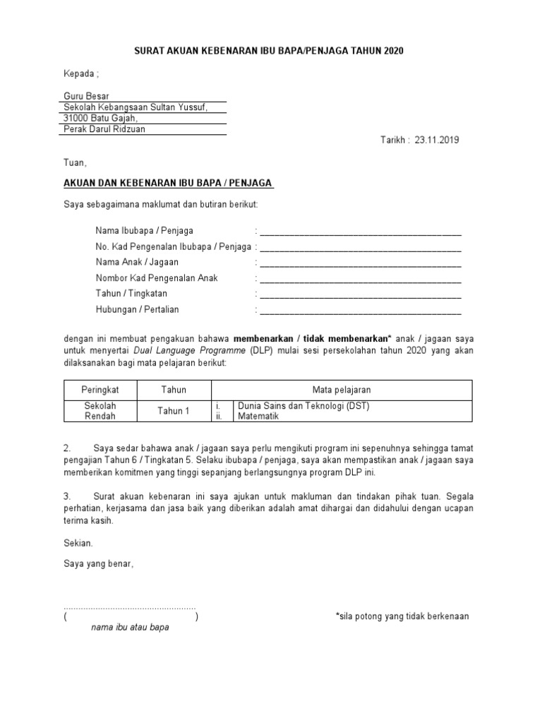 Surat Kebenaran Ibu Bapa Kelas Dlp 2019 Pdf