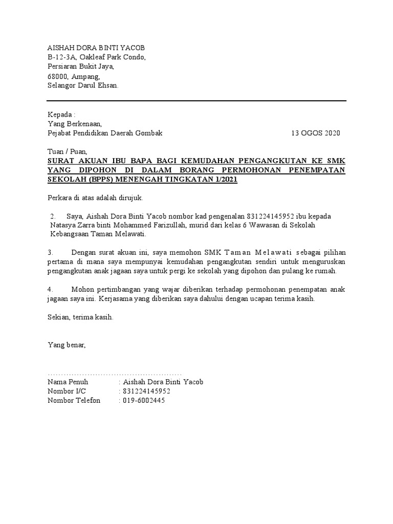 Surat Akuan Ibu Bapa Kemudahan Pengangkutan Tasya Pdf